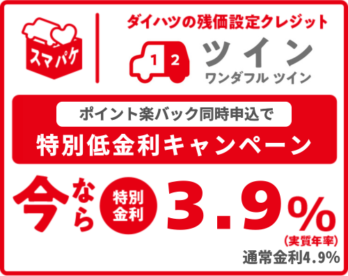 車両本体価格(消費税込) 1,897,500円 その他費用 91,446円 現金販売時お支払い総額 1,988,946円 お支払い回数 60回 割賦手数料率(実質年率) 3.9% 2025年10月現在 頭金(消費税相当額を含む) 550,000円 割賦元金 1,438,946円 初回お支払い額 12,615円 2回目以降(×49回) 9,900円 ボーナス月(×9回) 60,000円 59回までのお支払い合計(A) 1,587,715円 最終回(60回)のお支払い ご選択(1)新車に代替 ※1 0円 (2)おクルマをご返却 ※2 (3)お乗り続ける場合(B)